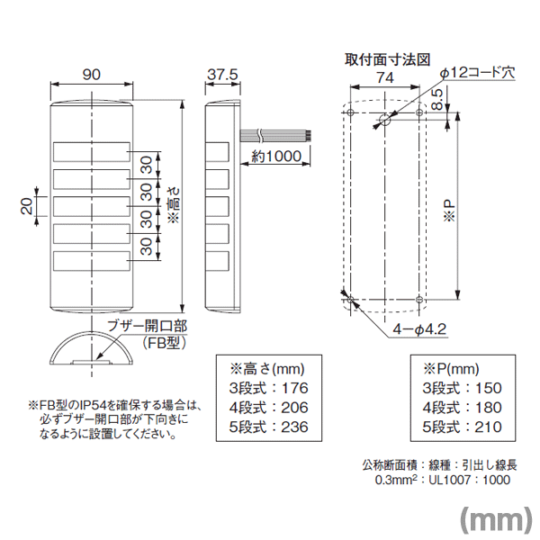 [機種名] WE-302FB-RYG [点灯色] 赤,黄,緑(上段から順に呼称) [カバー仕様] クロムメッキ仕様 [定格電圧] DC24V(無極性) / AC24V(50/60Hz) [使用電圧範囲] 定格電圧±10% [定格消費電流(信号線電流)] LEDユニット1段あたり 標準: 24.0mA(赤,黄), 14.3mA (緑) 最大: 28.0mA(赤), 27.0mA(黄), 20.9mA(緑) ブザー 標準: 40.0mA 最大: 50.0mA(突入電流:250mA) [使用温度範囲(相対湿度)] -30℃ 〜 +60℃(90%RH 以下、結露なきこと) [取付指定] 場所:屋内専用 / 方向:正・横・逆方向 [保護特性] IP54(正面取付け時に限る) [耐振動性] 19.6m/s^2 (JIS C 0911-1984(30Hz) 合格) [絶縁抵抗] 電源充電部と非充電金属部間 DC500V メガにて 1MΩ以上 [耐圧] 電源充電部と非充電金属部間 AC500V にて 1分間 [点滅回数] 60±12回/分 [ブザー] 音圧レベル: 最大90dB(ブザー開口部方向、1m、A特性) 音色: ブザー1:ピピピピ / ブザー2: ピーピーピー [光度] 赤: 600mcd 以上 黄: 800mcd 以上 緑: 6300mcd 以上 [質量(公差:±10%)] 0.33kg ※EN 規格に適合しており、CE マーキングを表示しています。